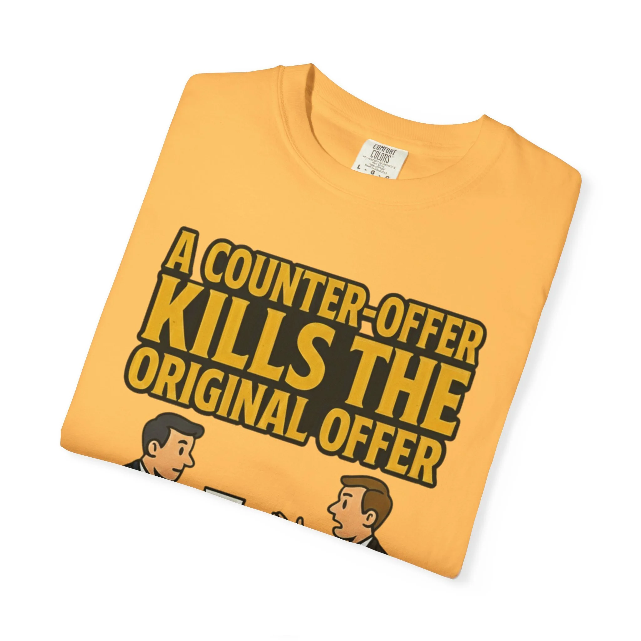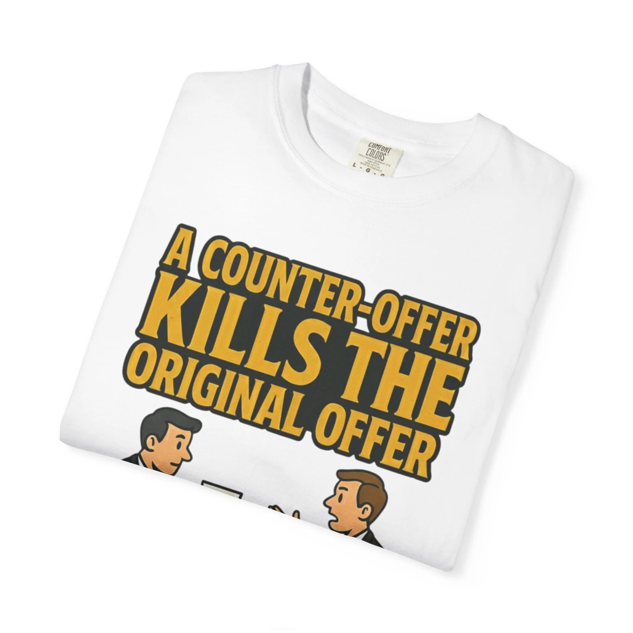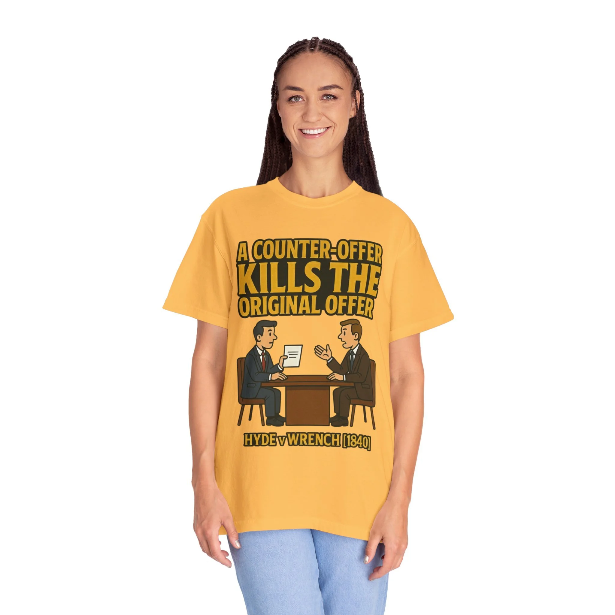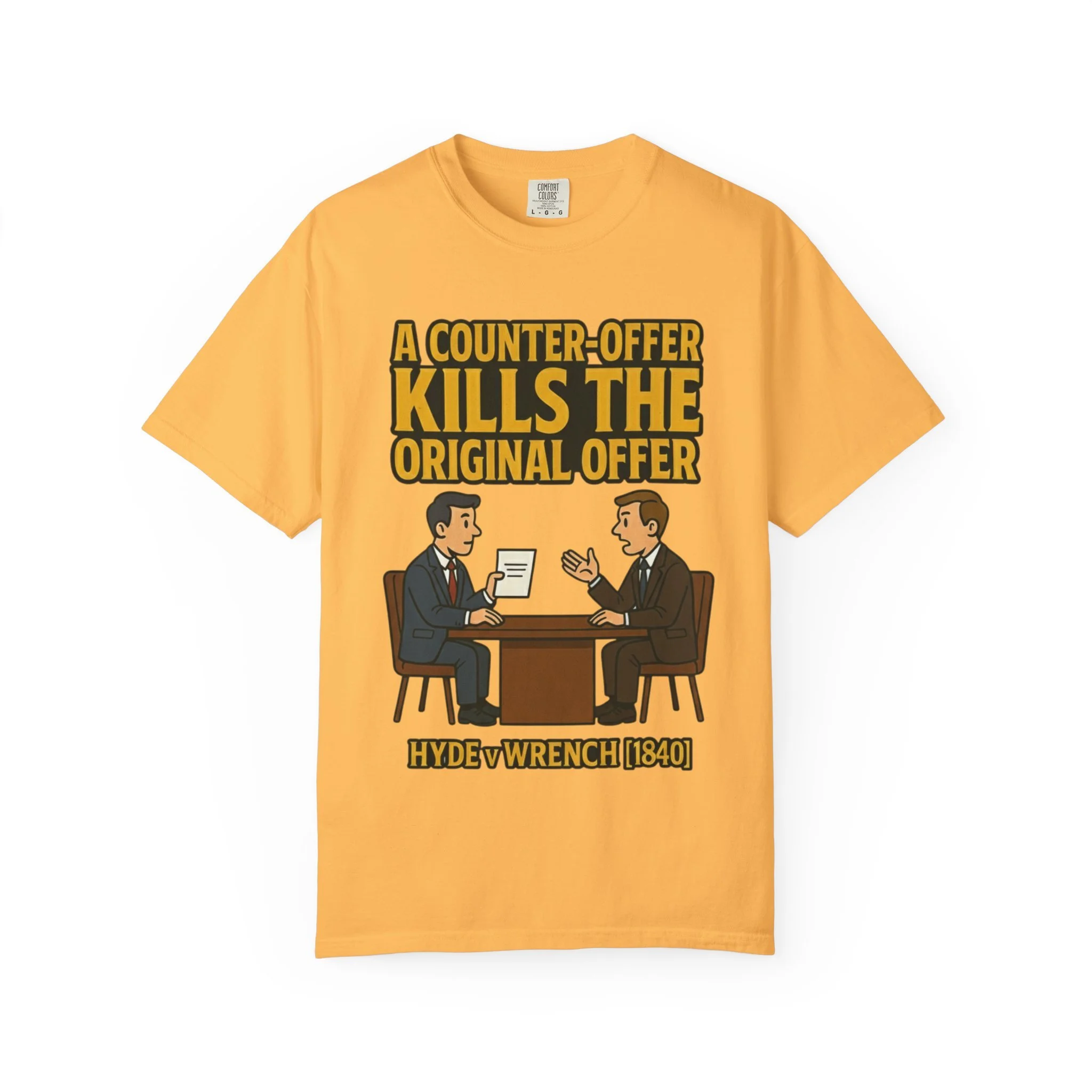 The Case of the Rejected Proposal In 1840, Wrench offered to sell his farm to Hyde for £1,000. Hyde replied with an offer of £950. When Wrench refused, Hyde immediately tried to accept the original £1,000 price—but the court ruled it was too late. This landmark case established the "Mirror Image Rule" in contract law: a counter-offer is not just a negotiation; it is a legal rejection that "kills" the original offer forever. This shirt is a tribute to the precision of contract formation and the high cost of a low-ball bid.