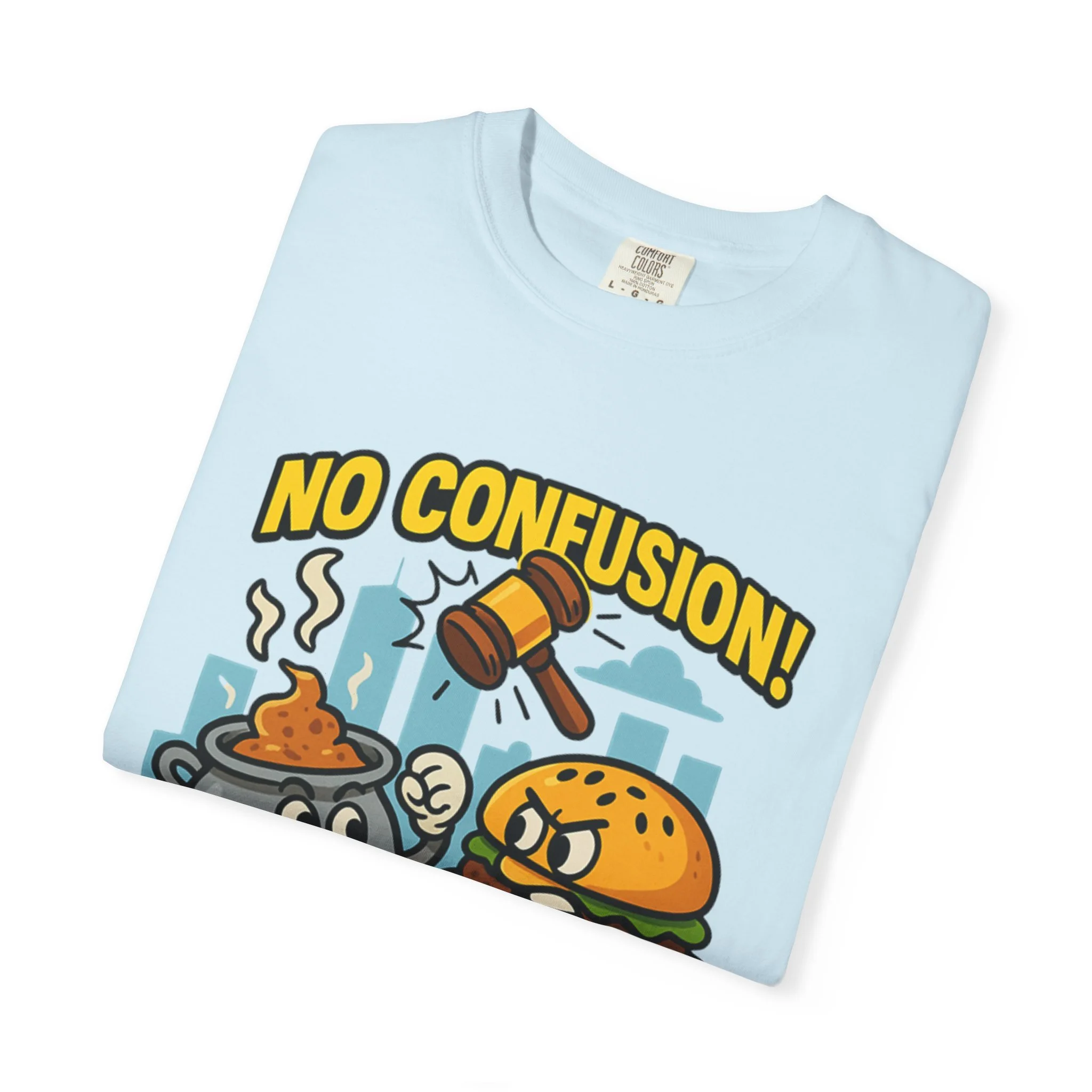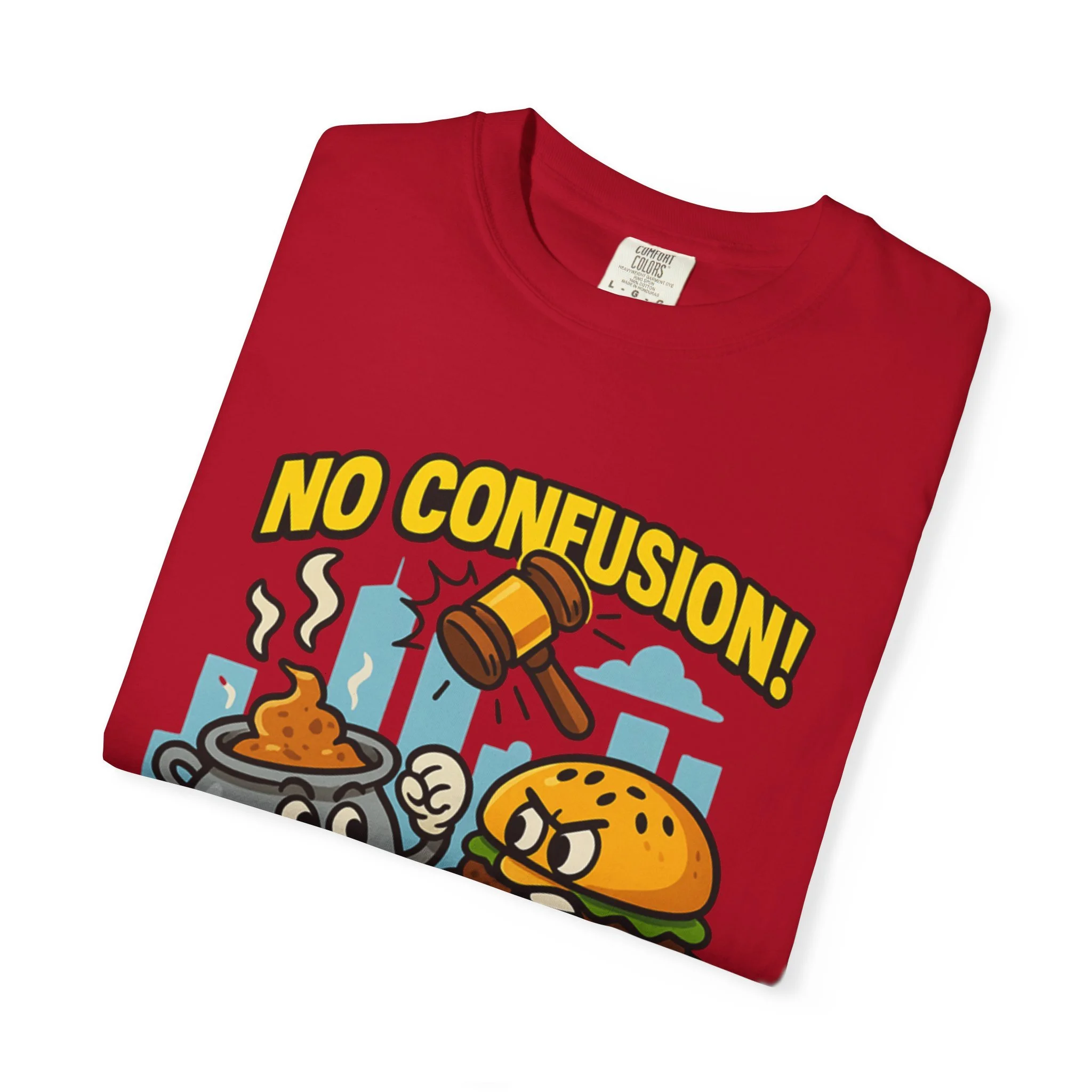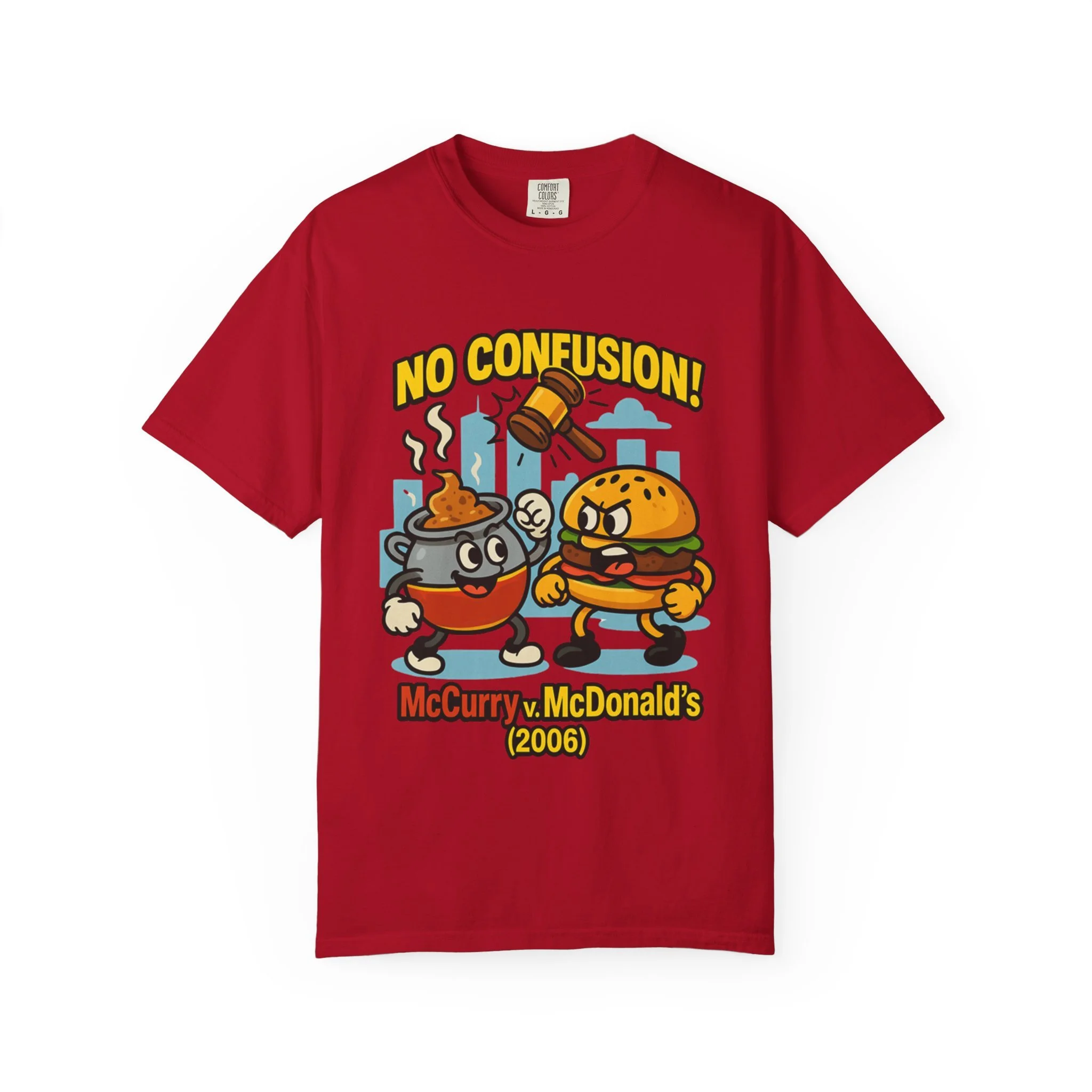A tongue-in-cheek tee for anyone who loves legal oddities and brand battles. The design pits a humble McCurry pot against a cheeky McDonald’s burger beneath a stern judge’s gavel, with the bold declaration “NO CONFUSION!” It captures the spirit of the Malaysian trademark dispute over the “Mc” prefix, turning a niche legal debate into wearable humor. Wear it to law school, classroom debates, legal conferences, or casual hangouts to spark conversation and smiles. The garment-dyed finish gives the shirt a lived-in softness and vintage vibe that matches the satirical artwork, while the heavyweight fabric and relaxed fit keep it comfortable through long study sessions, court runs, or weekend meetups. This tee speaks to trademark nerds, IP students, and anyone who appreciates clever commentary on branding and consumer perception.